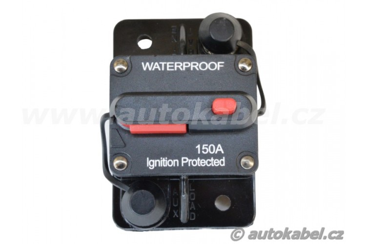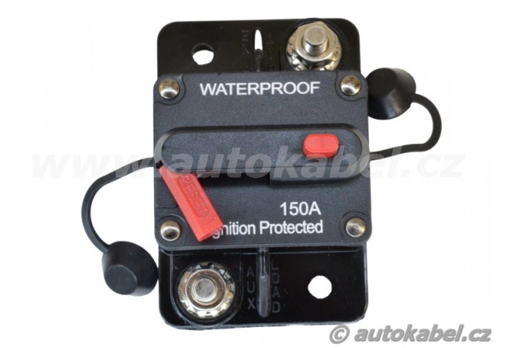 DC obvodový přerušovač - jistič 150A. Používá se jako náhrada klasických tavných pojistek v elektrických obvodech, kde je výhodou možnost restartování jen stiskem tlačítka. Určeno pouze pro nízkonapěťové DC aplikace.