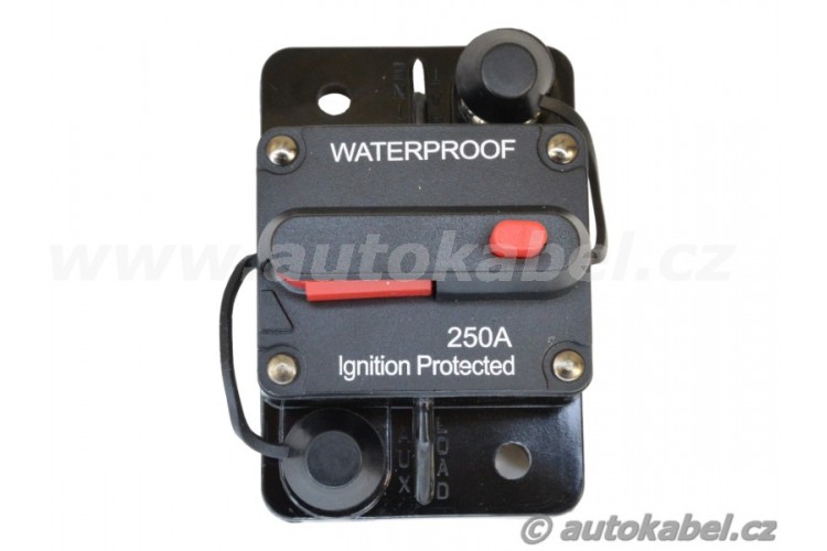 DC obvodový přerušovač - jistič 250A. Používá se jako náhrada klasických tavných pojistek v elektrických obvodech, kde je výhodou možnost restartování jen stiskem tlačítka. Určeno pouze pro nízkonapěťové DC aplikace.